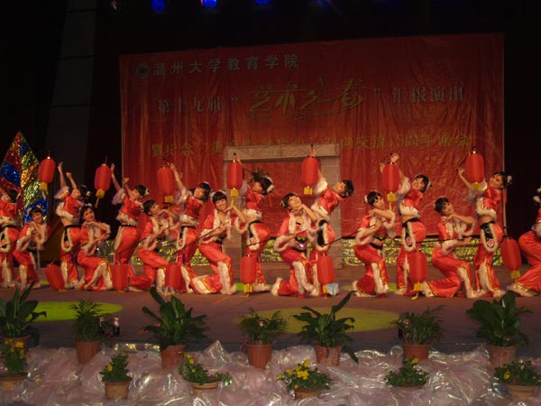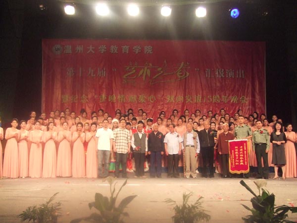 5月20日晚,90足球直播网 第19届“艺术之春”汇报演出暨纪念“重晚情 献爱心”双向交流15周年晚会在育英大礼堂隆重举行,会场外张灯结彩、画满全场——本届艺术节的优秀美术作品展在此展出,场内热闹非凡、座无虚席——精彩的艺术节汇报演出即将开始。90直播 党委书记胡伟国、温州大学团委副书记杨立淮、90直播 党委副书记嵇小怡和温州市军分区干休所的23名老干部、老领导们出席汇报演出。