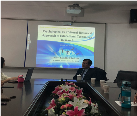 2019年3月27日下午两点,温州大学教师90直播 老师和研究生在9A410会议室聆听了由韩国全南大学教育系Hoisoo Kim教授主讲的“Psychological vs. Cultural-Historical Approach to Educational Technology Research”专题讲座。