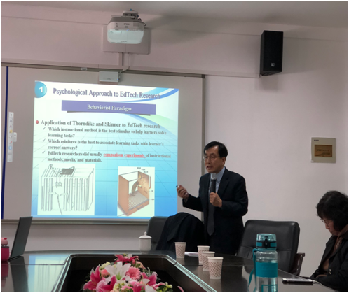 讲座开始,郑晓丽副教授对Hoisoo Kim教授的主要研究领域和成就做了简介,并对Hoisoo Kim教授的到来表示热烈欢迎。讲座中,Hoisoo Kim教授首先给同学们讲述了他近日爬大罗山的经历,他认为站在大罗山顶可以俯视整座城市。由这一视角出发,在接下来的讲座中,金教授一步一步带领同学们攀登“教育技术学研究”高峰,并带领同学们纵观“教育技术学研究”理论框架。