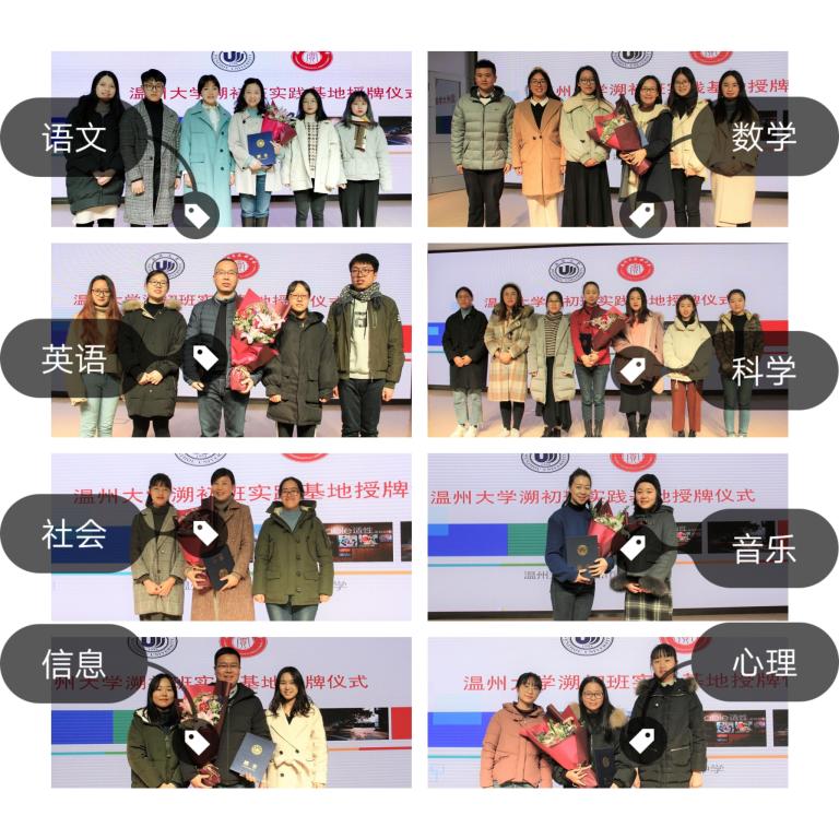 记录最美瞬间,定格历史时刻。温州大学教务处胡瑜副处长向温州市实验中学黄慧副校长颁授了“温州大学溯初班教育实践基地”牌匾,并向八位各学科导师颁发聘书。溯初班歌学科学员代表纷纷上台为导师们献花。全体老师与溯初班初中方向全体学员共同合影留念,记录师生初识相遇的珍贵瞬间,定格两校强强联手的历史时刻。