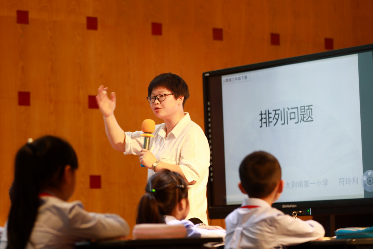 浙江省教坛新秀、温州市名师符玲利老师执教三下《排列问题》。符老师一开始从二年级的1、2、3能组成几个不同的两位数导入,有效回顾了“固定十位法”、“固定个位法”以及“交换法”。接着符老师请学生试着用1、2、3、□组成不重复的两位数,通过讨论不同填法会有几个两位数,突破本节课的重难点。符老师通过引导学生写算式方式计算两位数的个数开拓学生的思维。将课堂还给学生,让他们有充足思考与练写,数理思维水到渠成。