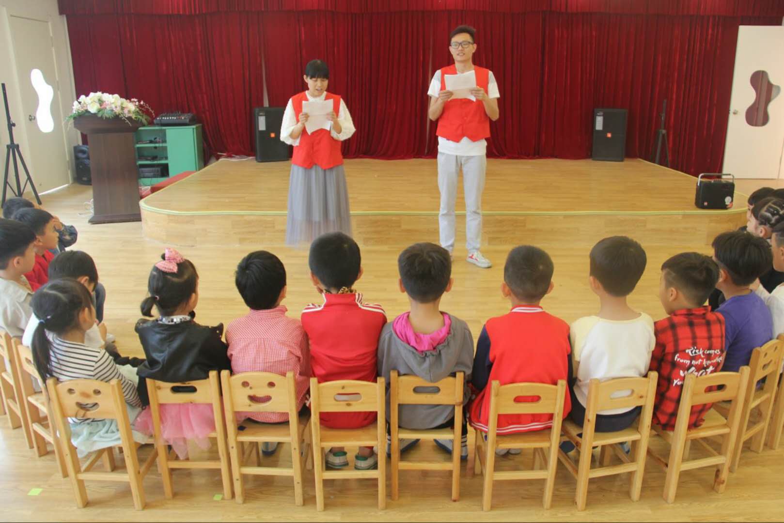 蔡静和顾瑞希同学教小朋友们唱《魔法城堡》和《虫儿飞》的儿歌,小朋友们唱的特别开心,最终都意犹未尽,于是大家还一起合唱了《青春修炼手册》,歌曲在带给小朋友快乐的同时也带给我们志愿者无限的快乐;最特别有意思的手指操,由陈跃洁同学教授,小朋友们几乎对这个节目都很感兴趣,都学的特别认真。郭静和张乐同学为小朋友们朗诵诗歌《妈妈是棵树》和《今天,我们是初升的太阳》,小朋友们听了之后都懂得了应该要做一个孝顺的孩子。