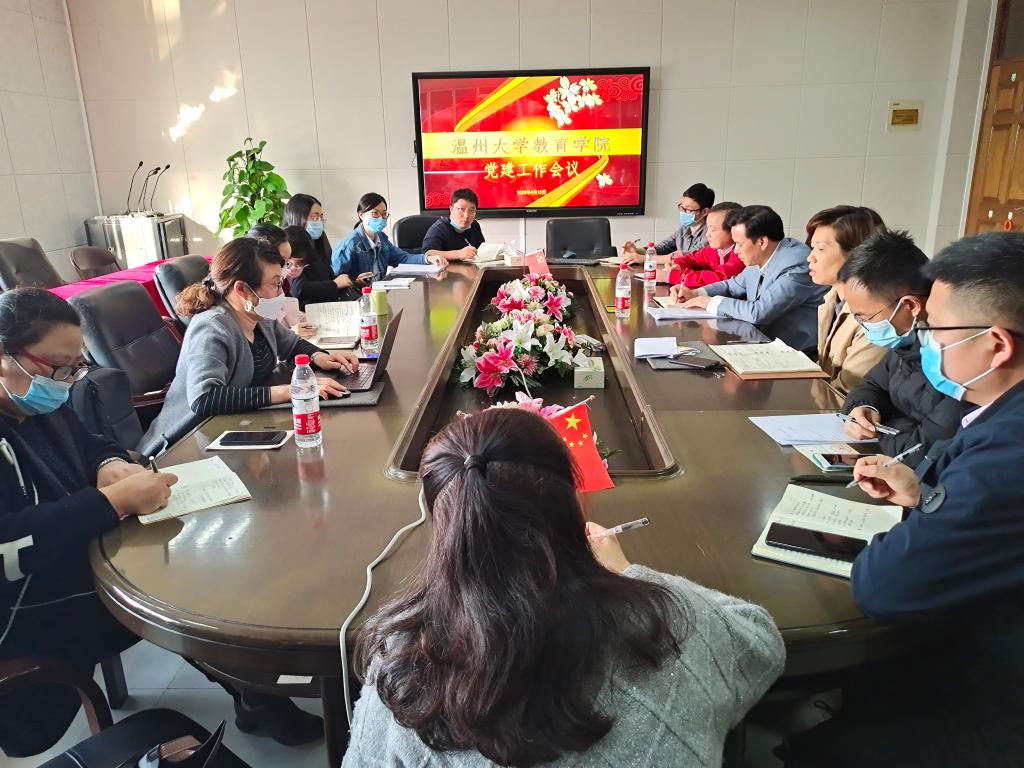 党委书记何毅首先回顾开学以来学院党建工作开展情况,对疫情防控期间各支部主题党日活动精彩纷呈、师生党员充分发挥党员抗疫先锋模范作用、各党支部基层组织建设常抓不懈等予以充分肯定。接着,何书记带领大家学习《温州大学2020 年基层党建“提质创优”工作清单》精神,对文件内容逐条逐项进行解读,并结合学院党建工作进行强调和阐释。