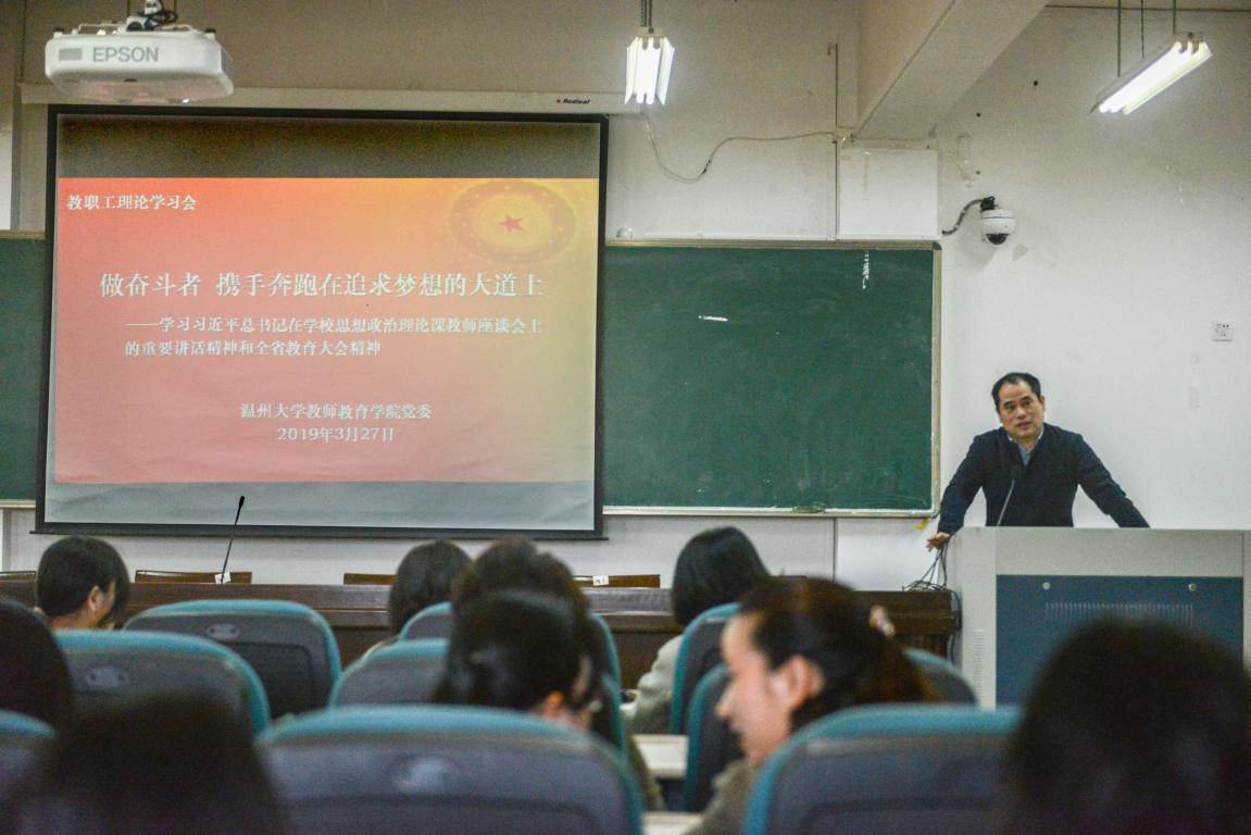 会议组织全院教职工专题学习习近平总书记在学校思想政治理论课教师座谈会上的重要讲话精神、全省教育大会精神和学校党委《关于开展“立足新起点、锚定新目标、抢抓新机遇,奋力书写新时代学校改革发展新篇章”大讨论活动的通知》的文件精神。杨立淮书记作《做奋斗者 携手奔跑在追求梦想的大道上》专题报告。他在报告中指出,习近平总书记在学校思想政治理论课教师座谈会上的讲话是全面贯彻党的教育方针的重要讲话,回答了教育的根本问题:培养什么人、怎样培养人、为谁培养人,强调教育的根本任务就是立德树人,我们的教育是为人民服务、为中国共产党治国理政服务、为巩固和发展中国特色社会主义制度服务、为改革开放和社会主义现代化服务。3月22日,全省教育大会22日在杭举行。省委书记车俊在会上强调,要深入学习贯彻习近平总书记关于教育的重要论述和全国教育大会精神,优先推进教育高质量发展,率先高水平实现教育现代化,培养德智体美劳全面发展的社会主义建设者和接班人,为我国建成学习大国、人力资源强国、人才强国贡献浙江力量。杨立淮书记还带领大家学习了校党委书记谢树华在教代会上的讲话精神和赵敏校长教代会报告精神,并结合学校党委《关于开展“立足新起点、锚定新目标、抢抓新机遇,奋力书写新时代学校改革发展新篇章”大讨论活动的通知》的文件精神,点明现在学院发展正处在转型发展关键期、人才培养和引进繁重期以及同类院校激烈竞争期,我们要处理好稳定发展和快速发展的关系,并号召每位教师都要做奋斗者,要培养学生做新时代的奋斗者。