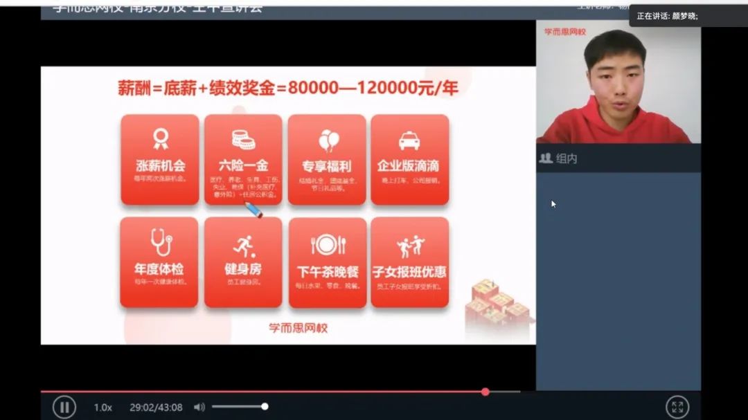 3月25日下午,学而思网校-南京分校线上宣讲会在腾讯会议展开。学而思网校是小初高全学科在线教育品牌,也是最受欢迎的雇主品牌。它的师资团队由清华、北大、哈佛等知名高校毕业生组建而成,采用“主讲老师+辅导老师”的双师直播教学模式,将自主研发的表情识别、语音识别、语音评测等AI技术引入课堂,实现随堂测试、实时互动、语音测评等,能够有效提升在线学习的趣味性及互动性。宣讲人从行业解析、企业介绍、岗位晋升及福利、应聘流程这四方面进行了全面详细的介绍,并欢迎大家踊跃投递简历。