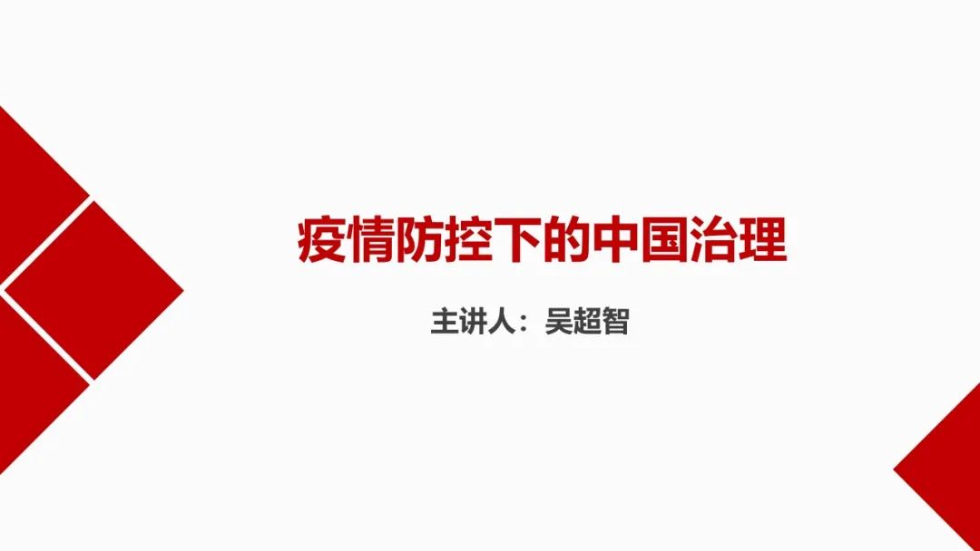 首先,由吴超智老师带来主题为“疫情防控下的中国治理”的讲座分享。她从党的集中统一领导制度、全民动员制度、人民利益至上的执政理念、信息及时公开制度等方面,谈到我国面对疫情时,科学预见、断然决策、迅速行动、战略判断、战役部署,同时中国与国际社会一道守望相助、相互支持,最大程度地去抢救和维护各国人民的生命安全和健康。并讲述了在各种考验中,我国如何推进国家治理体系和治理能力现代化。结合各种实际案例,我们看到了中国的大国担当。疫情面前,有一种担当,叫中国担当;疫情面前,有一种力量,叫中国力量;疫情面前,有一种团结,叫中国团结。无论是近代还是现如今,我们都相信,只要全体中国人民众志成城、守望相助,在党和政府的坚强领导下,依赖科学、组织抗击,中国必将取得抗疫斗争的胜利!