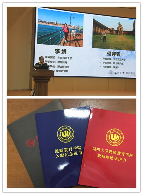 学院举行了新教师入职仪式,近期学院新进李娟、何奔奔二名教职工。杨立淮书记向全院教职工介绍新教职工的基本情况后,孙芙蓉院长、杨立淮书记向新教师送上了入职纪念证书、校情院情介绍、学校教师职业规范要求资料及联络服务卡等,新老师签订师德承诺书,承诺要依法从教,严守师德规范,做“四有”好老师。新老师所在系(科室)的各位领导为他们佩戴上“温州大学”鲜红的校徽,以此表达学院对新老师们的热烈欢迎,希望他们在温州大学严守师德规范,教书育人,安居乐业,与学院师生一起共创美好明天。