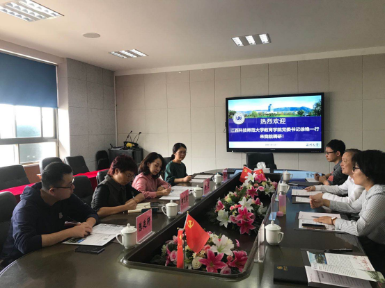 2020年10月13日下午,江西科技师范大学90直播 党委书记徐艳、教师教育教研中心办公室主任付敏、教学办公室主任何玉霞、陈廷轩老师一行莅临90足球直播网 ,90足球直播网 党委书记何毅、副院长叶新东、学前系主任李娟、学前教育科副主管刘荣建、教务科科员金怡妮出席接待。