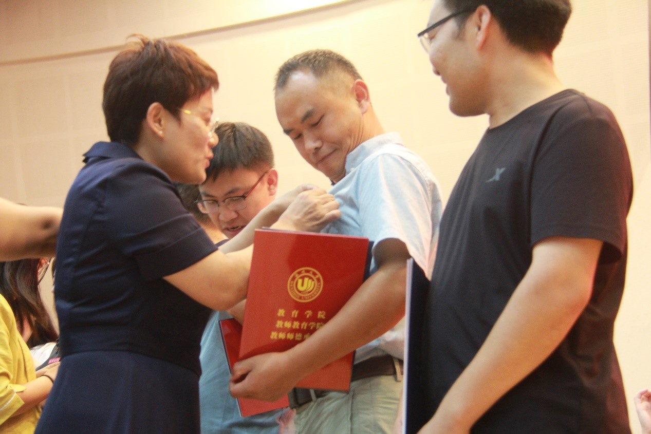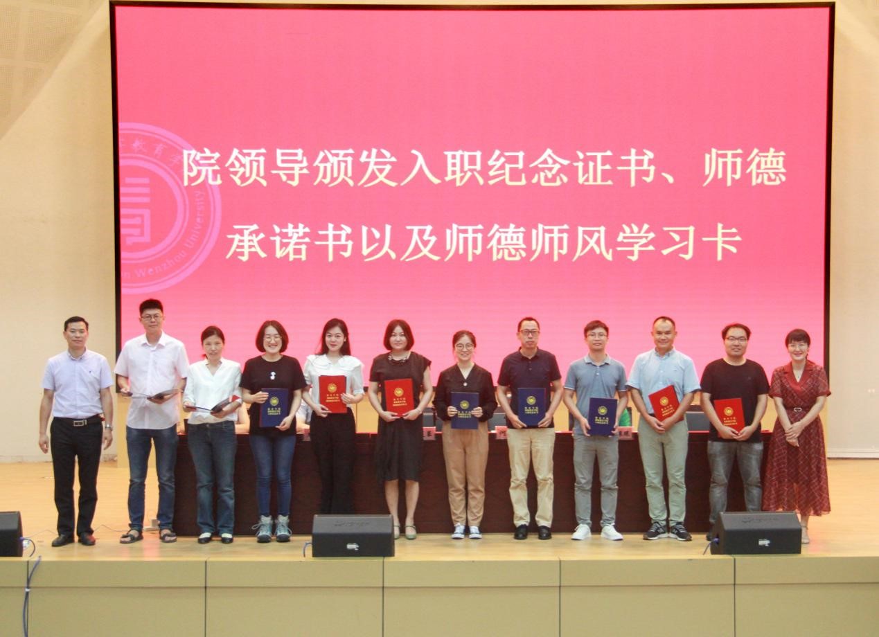 会议首先进行了简单、隆重的新进教职员工入职仪式。何毅书记对新教师逐一进行介绍,院领导为19位新教师颁发了入职纪念证书、师德承诺书以及师德师风学习卡,各系负责人为新教师佩戴校徽,以此表达学院对新入职老师的热烈欢迎和殷切期望。