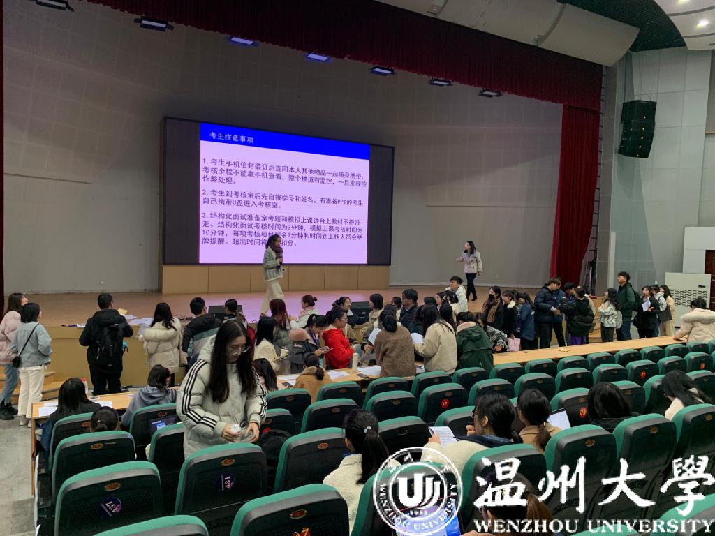 12月28日,在90足球直播网 举行“结构化面试·模拟上课”项目考核,分设32个考场,由64位相关专业及部分校外指导老师担任了评委工作。90足球直播网 林琛琛副院长、教师培养基地蒋金崇主任亲临现场指导考核工作。考生们严格遵守考场纪律及流程安排,认真准备,通过结构化面试和模拟上课展现了师范生的教学功底和综合素养。