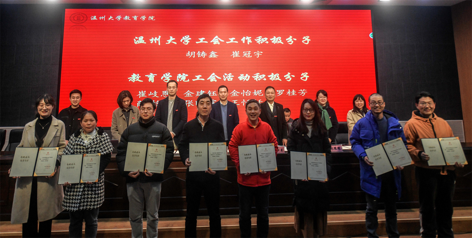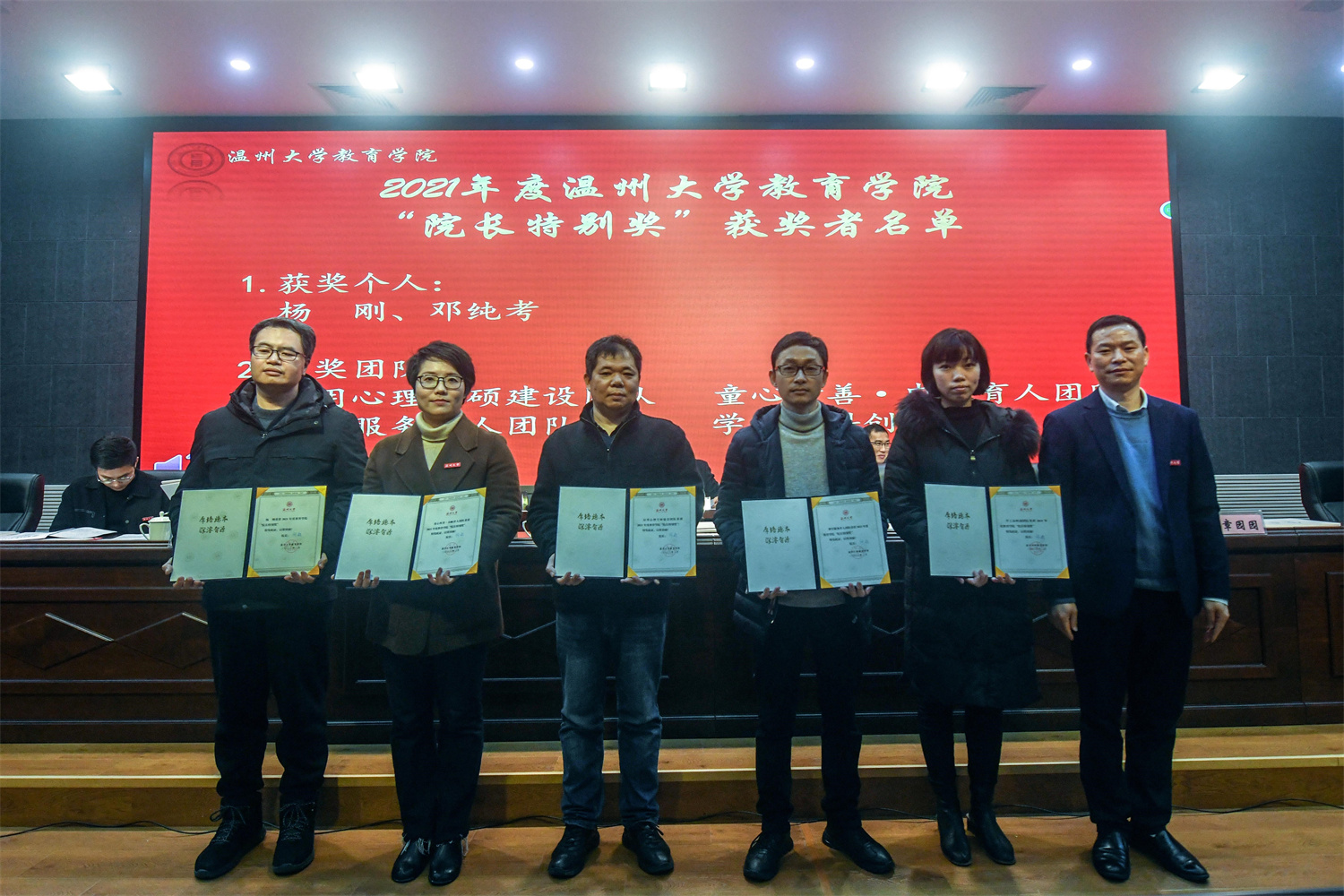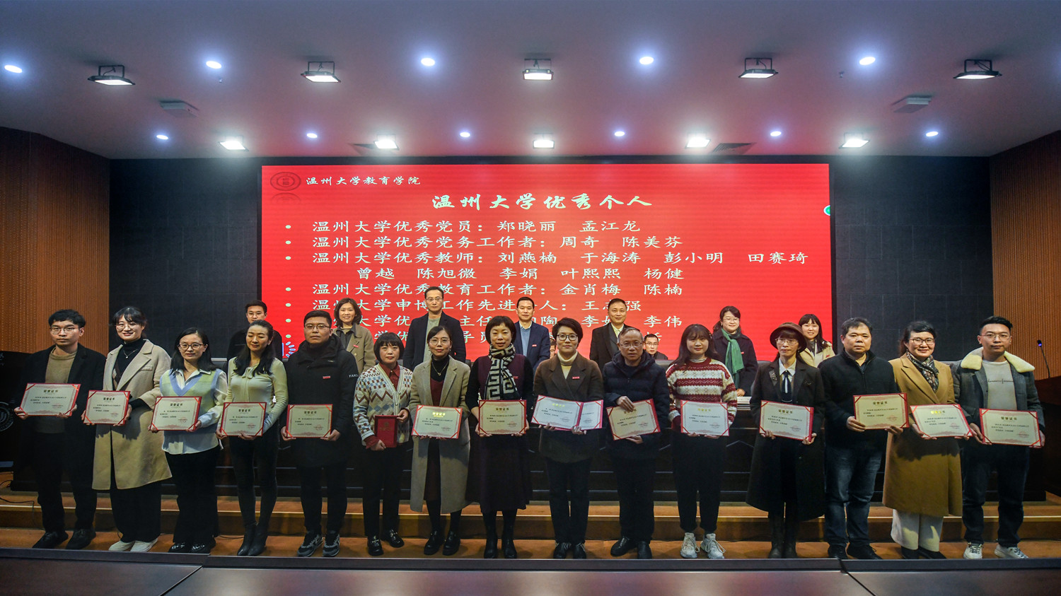 在欢快的音乐中,学院领导为2021年度温州大学优秀党员、优秀党务工作者、优秀教师、优秀教育工作者、优秀班主任、优秀辅导员及申博工作先进个人,学院“院长特别奖”获得者,校工会工作积极分子,院工会活动积极分子,学院就业奖励获得者、先进个人、优秀培训项目等进行颁奖。会议并对学院2021年度在教学科研、人才培养等方面取得的成绩进行了展示。