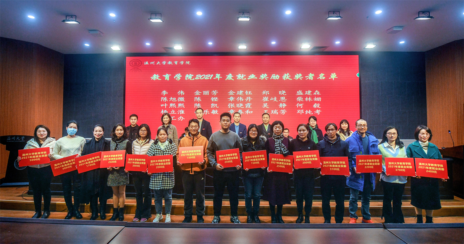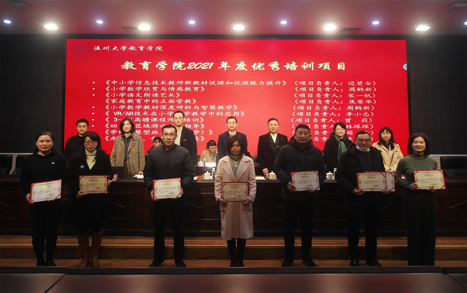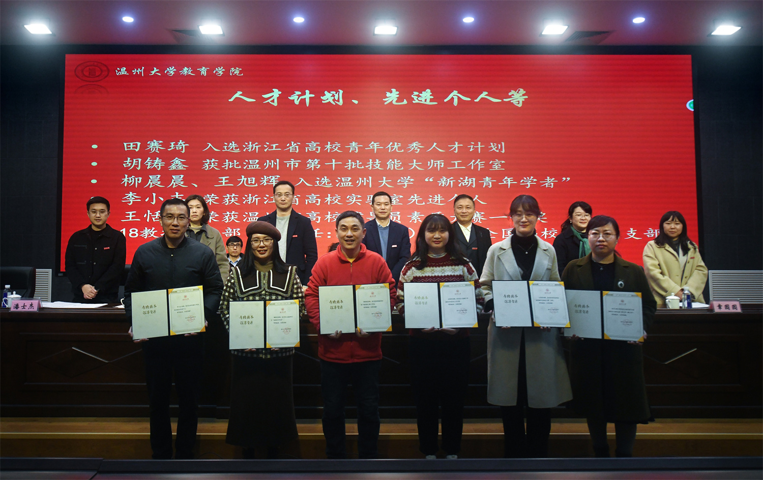 在欢快的音乐中,学院领导为2021年度温州大学优秀党员、优秀党务工作者、优秀教师、优秀教育工作者、优秀班主任、优秀辅导员及申博工作先进个人,学院“院长特别奖”获得者,校工会工作积极分子,院工会活动积极分子,学院就业奖励获得者、先进个人、优秀培训项目等进行颁奖。会议并对学院2021年度在教学科研、人才培养等方面取得的成绩进行了展示。