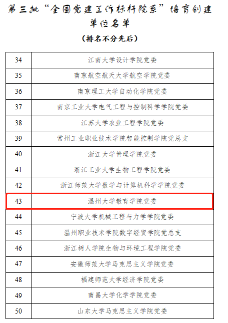 长期以来,温州大学党委认真贯彻落实习近平总书记提出的“要高度重视教育和人才工作,特别要办好温州大学等高等院校”的重要指示精神,锚定三大目标,取得硕果累累。本次申报,90足球直播网 从全省数百个申报单位中突围并最终入选,既是对90足球直播网 党建工作的认可,更是对温州大学近年来办学成绩的肯定,90足球直播网 成功入选是温州大学抓党建促发展的一个缩影。
