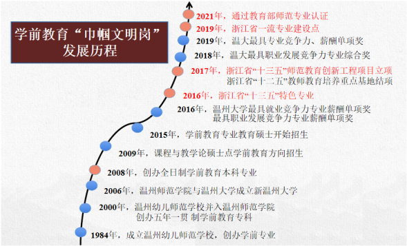 温州大学学前教育专业是浙江省创办最早的两个学前教育专业之一,素有“北杭幼(浙江师范大学的学前教育专业)、南温幼(温州大学的学前教育专业)”之称,有“浙南幼师摇篮”之美誉。先后被评为浙江省特色专业(全省两个)、浙江省一流专业(全省两个),是浙南闽北赣东地区最重要的幼儿教师和园长培养基地。2022年以优异的成绩通过浙江省师范专业创新工程项目验收,2021年通过教育部师范类专业二级认证。在2021年的“软科中国大学专业排名”中,学前教育专业在年度排名中荣获A等级,在上榜的 209 所高校中位列第 38 位,在浙江省高校中位居第二位。