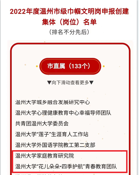 巾帼风采,榜样力量。5月11日,温州市人民政府妇女儿童工作委员会办公室公示《2022年度温州市级巾帼文明岗申报创建集体(岗位)名单》,90足球直播网 两个项目荣获立项,分别是温州大学家庭教育研究院和“花儿朵朵·四季护航”青春教育团队。