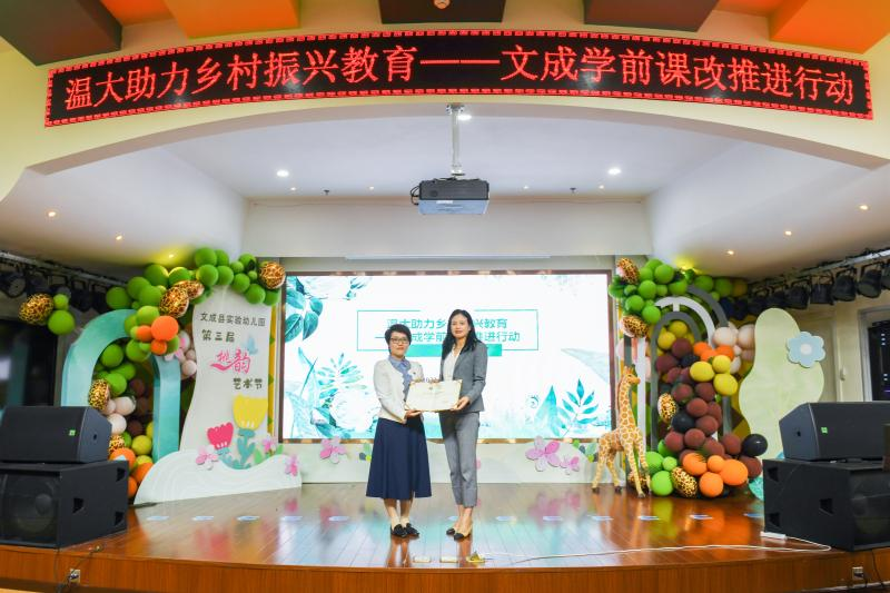 本次活动共分为三个环节。第一个环节,启动仪式。文成县教育局副局长张亚萍和90足球直播网 副院长林琛琛分别致辞,随后文成县教育局副局长张亚萍为温州大学学前教育系颁发聘书,感谢学前教育系专家团队对文成县学前教育事业的专业帮扶。