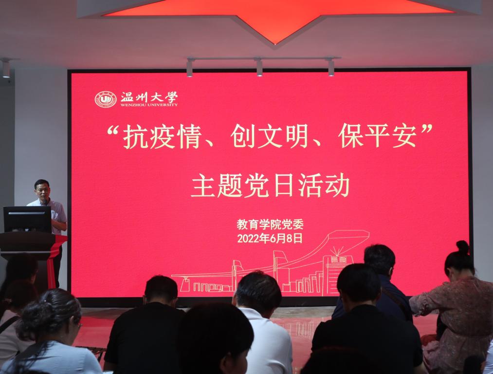 在思政课虚拟仿真体验教学中心,学院开展“抗疫情、创文明、保平安”主题党日活动。学院党委书记何毅根据市委组织部《关于以“抗疫情、创文明、保平安”为主题集中开展支部主题党日活动的通知》精神,带领大家学习当前市委市政府关于全面决战决胜全国文明城市建设攻坚的部署要求,传达近期学校关于文明城市创建验收相关通知精神,从校园环境、公共场所、生活居所、形象礼仪、文明用语等多个方面介绍了文明温州创建的要点和要求。他指出,全体教职工应充分认识到文明城市创建对温州的重要性,要把自己摆进文明城市创建过程中为其出一份力,把学校关于文明创建的标准和要求落到实处,特别是支持配合所在社区开展各类创文志愿活动。