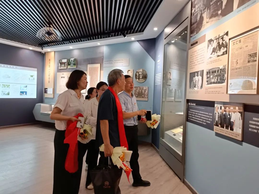 新老党员们参观苏步青谷超豪纪念馆。馆厅前两位院士塑像神采奕奕、栩栩如生。展馆走廊内仿真场景、影音视频、媒体互动等技术生动展示了两位院士的丰富经历,在讲解员的带领下,全体党员全方位地了解两位温籍数学家的生平事迹与突出贡献。苏步青先生和谷超豪先生作为温州大学的燃灯者和提灯人,他们浓厚的家国情怀和无私付出精神,至今仍照耀着每一位温大师生。全体党员在聆听讲解和自由参观中,深切感受到苏步青、谷超豪二位老校长潜心钻研、勤学修德、为国为民的崇高精神,并纷纷表示始终不忘初心、牢记使命,坚定理想信念,继续砥砺奋进,将这种精神付诸于行。