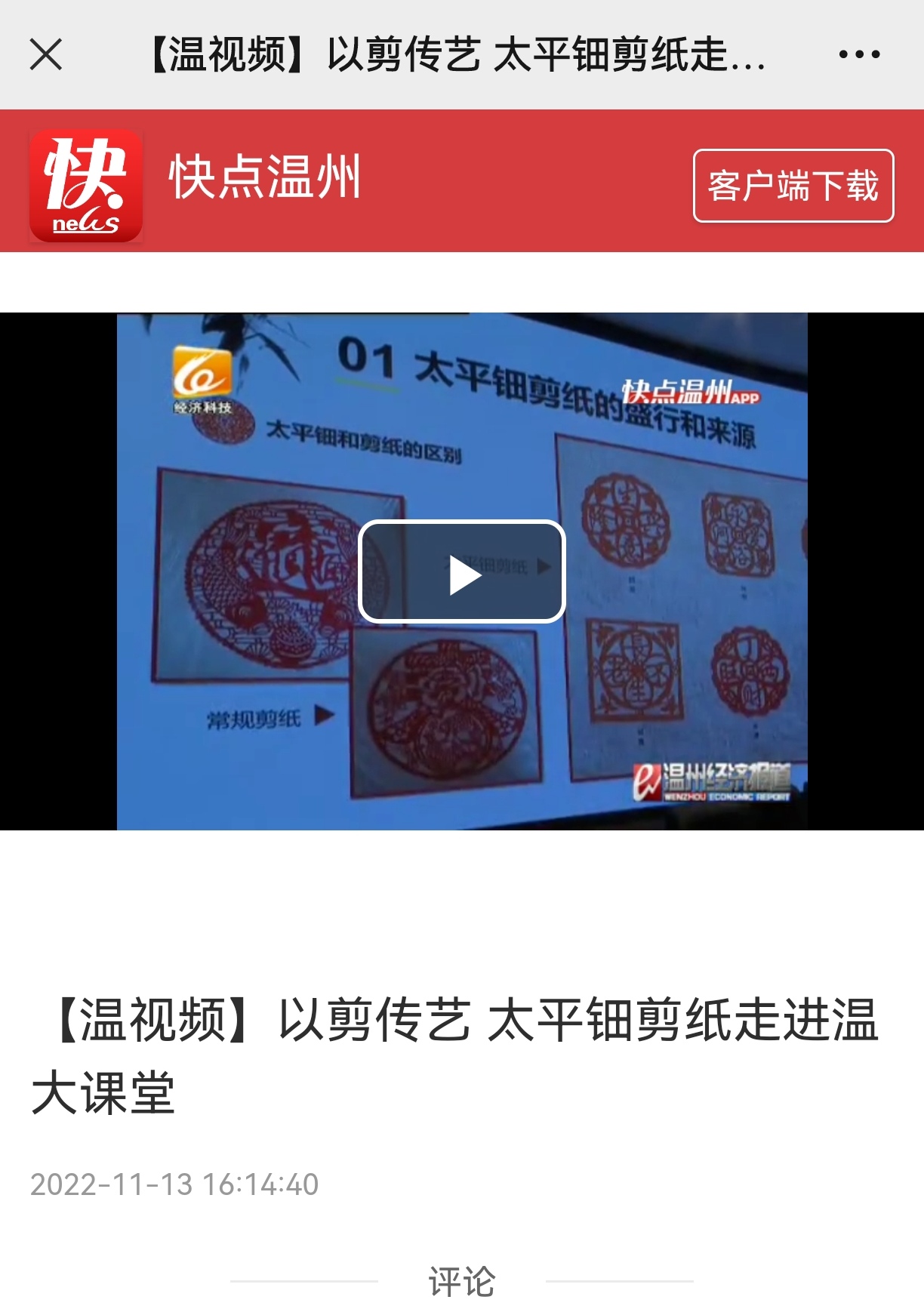 近日,太平钿剪纸非遗艺术走进温州大学教师90直播 课堂,1000多名学生感受指尖上的艺术传承,在倾听和体验中上了一堂生动的非遗“大思政课”。