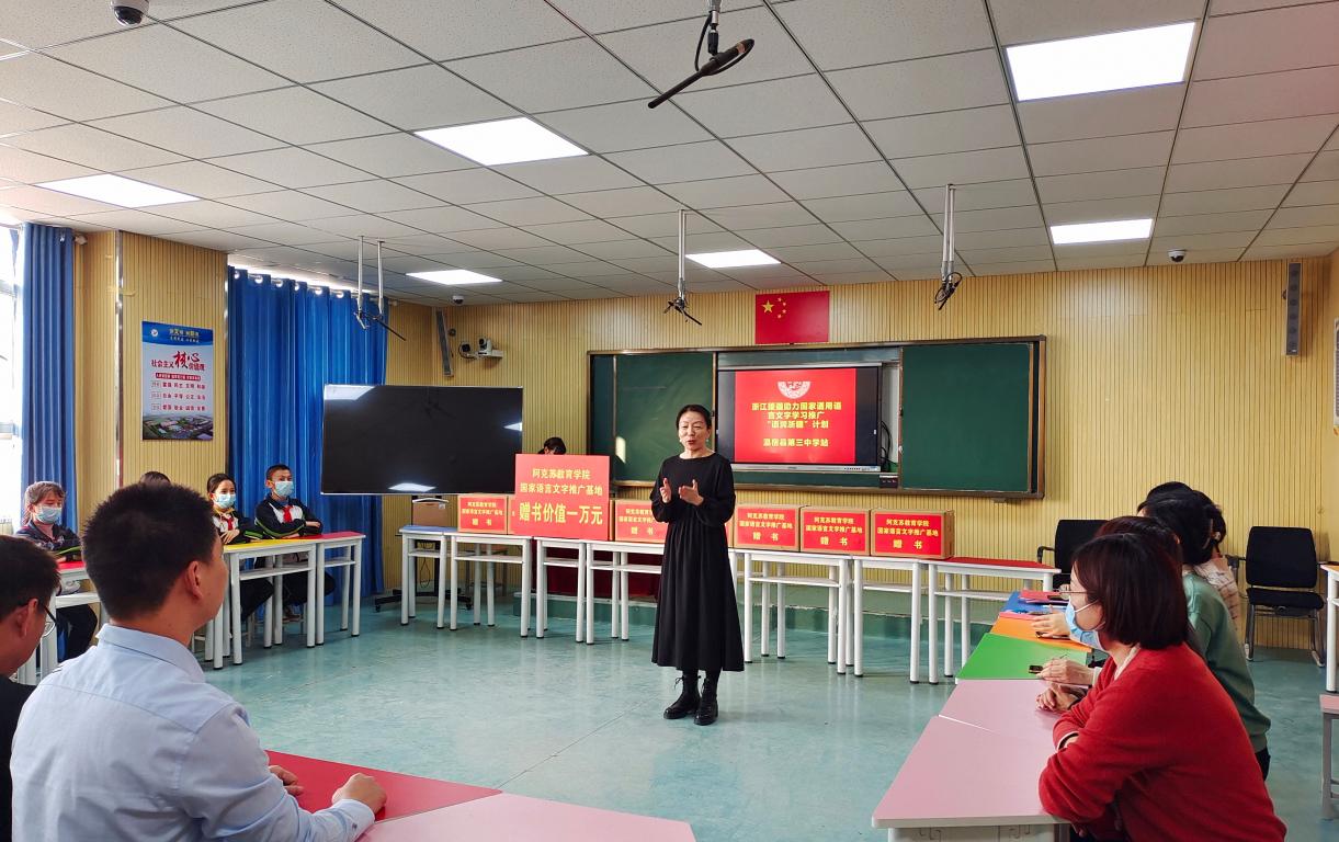 “垚垚俊峭天山,迢迢灵秀瓯江。凝心聚力倾情,推进语润浙疆。”近日,90足球直播网 援疆教师胡雯圆满结束了从浙到疆的“语润”之旅,满载而归。在学院举行的师德师风专题教育活动上,胡雯老师将她的“西行”故事娓娓道来。此番援疆,她“授人以渔”、育苗培才,也让国家通用语言文字走进城镇乡村,民族团结之花处处盛开。
