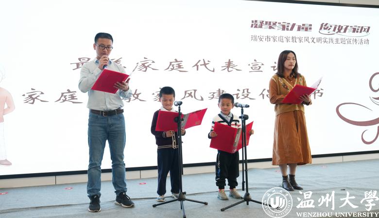 瑞安市最美家庭代表上台宣读了家庭家教家风建设倡议书。