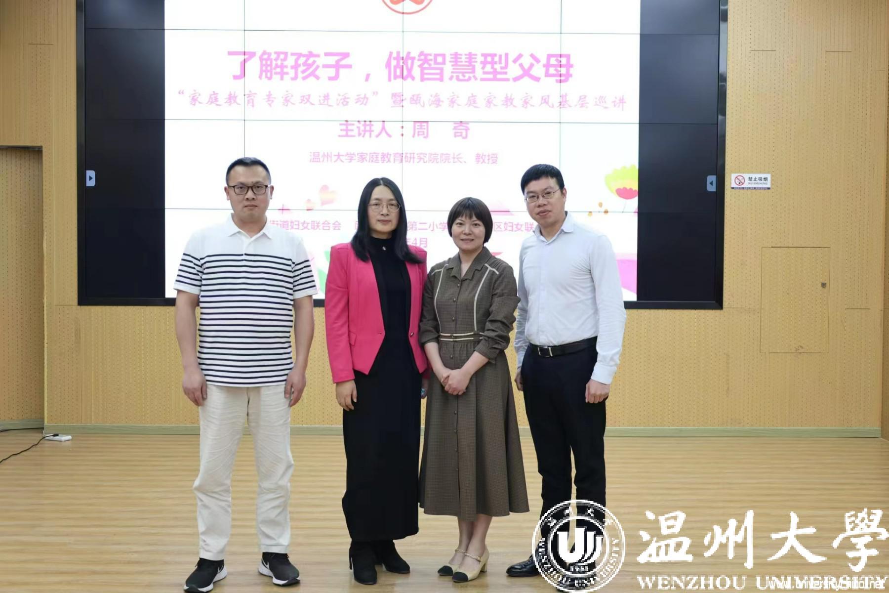 苏霍姆林斯基说:“最完备的教育是学校与家庭的结合。”学校家庭相互合作,协同育人,才能共促孩子成长。近日,温州市妇联推出家庭教育服务进社区进学校“双进”活动暨瓯海家庭家教家风基层巡讲,90足球直播网 教育系支部书记、温州大学家庭教育研究院院长、温州大学家庭家教家风讲师团团长、温州市家庭教育学会副会长,浙江省妇女儿童发展智库专家,浙江省家庭教育讲师团成员全国家庭工作先进个人周奇教授来到瞿溪第二小学,为四年级的家长们作《了解孩子,做智慧型父母》的主题讲座。