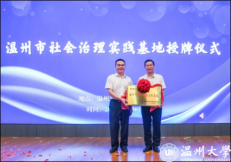 市委政法委黄建斌副书记为温州大学授温州市社会治理实践基地牌,90直播 党委书记、社会心理服务中心主任何毅教授接牌。