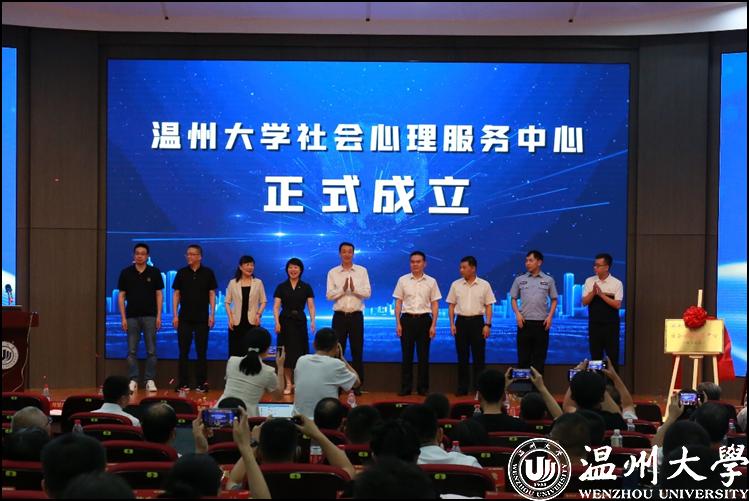 校党委张健书记,市委政法委黄建斌副书记,市卫健委孙坚副书记,市教育局倪彤副局长,市妇联副主席孙爱英及市公安局、市司法局、市中级人民法院、市人民检察院相关领导共同为温州大学社会心理服务中心揭牌。
