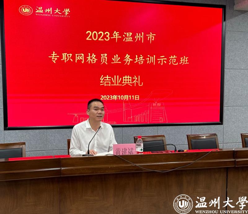 温州市委政法委副书记黄建斌做总结讲话。他对此次培训成果给予了充分肯定。他表示,此次培训邀请了市委政法委、市教育局、市公安局、市司法局、市卫健委、市应急管理局、市统计局、市消防救援支队和温州大学等9家部门的有关领导围绕网格中心工作进行了授课,大家学出了成效。他希望大家将这次培训的内容融会贯通,认真履职、担当作为,争取交出高分答卷。借此机会,黄书记就如何做好当前和今后一段时期的网格工作,谈了4点想法。一是要不忘初心,充分珍惜全市网格建设工作已取得的成效;二是要提高认识,高站位推进全市网格治理工作;三是要直面问题,清晰认识当前网格工作中存在的短板,他强调要稳定网格员队伍、完善工作机制突出区域特色;四是要强化担当,高效率开展网格常态排查走访,树立风险意识、稳定意识,以系统思维着力提升治理水平。