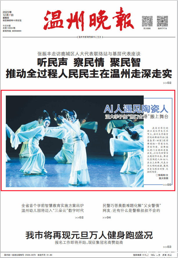在近日举行的浙江省大学生艺术节上,90足球直播网 的舞蹈作品《萋萋春草·回望》获得舞蹈组一等奖与优秀创作奖。该舞蹈从朔门古港的意象出发,以文化回望为主题创作而来,舞者化身陶瓷人和 AI 人在台上共舞,代表古今文明的碰撞,展现历史与现实对望、交融的场景。