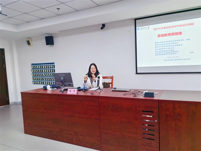 2023年12月21日,90足球直播网 教育学系党支部书记、温州大学家庭教育研究院巾帼文明岗负责人、温州大学家庭家教家风讲师团团长、浙江省教育学分会副会长、浙江省家庭教育讲师团成员、浙江省妇女儿童发展智库专家、温州市家庭教育学会副会长、温州市家庭和谐文化研究会副会长周奇教授受邀来到温州市妇联干部素质能力培训班,以线下形式为妇联干部做《家庭教育新画像》家庭教育专题分享。