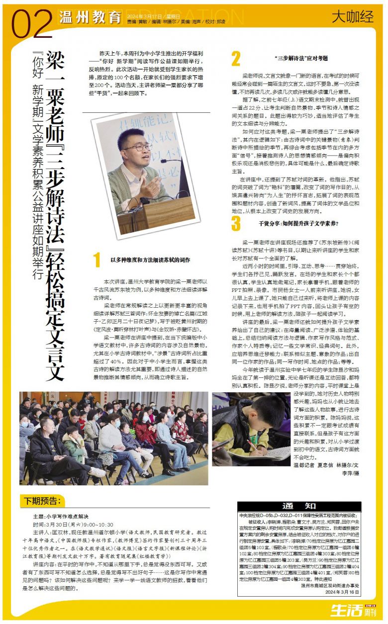 昨天上午,本周刊为中小学生推出的开学福利——“你好 新学期”阅读写作公益课如期举行,反响热烈。此次活动一开始就受到学生家长的热捧,原定的100个名额,在家长们的强烈要求下增至200个。活动当天,主讲老师梁一粟都分享了哪些“干货”,一起来回顾下。
