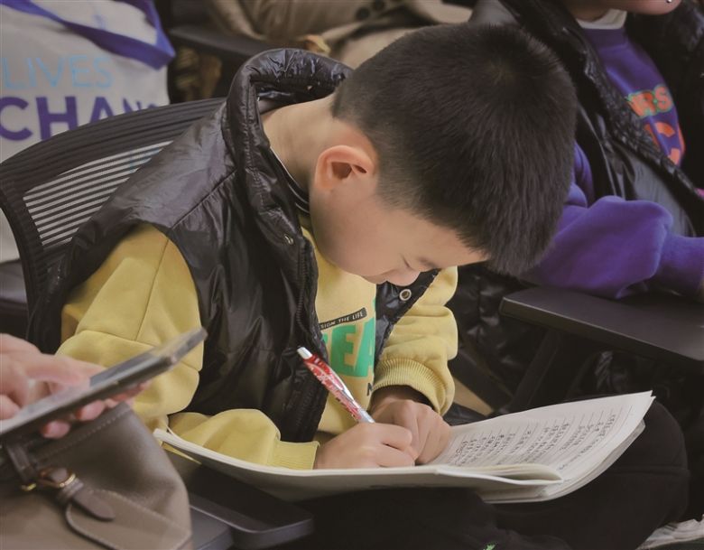 近两小时的时间里,引导、互动、思考……贯穿始终,学生们各抒己见,踊跃发言。在场的学生和家长个个都很认真,学生认真地做笔记,家长拿着手机,跟着老师的PPT拍照、录像。市民杨女士一人前来听讲座,她说,女儿早上去上课了,她只能自己过来听,将老师上课的内容记录下来,也用手机拍了PPT内容,回头让孩子有空的时候,用上老师的解读方法,陪孩子一起阅读学习。