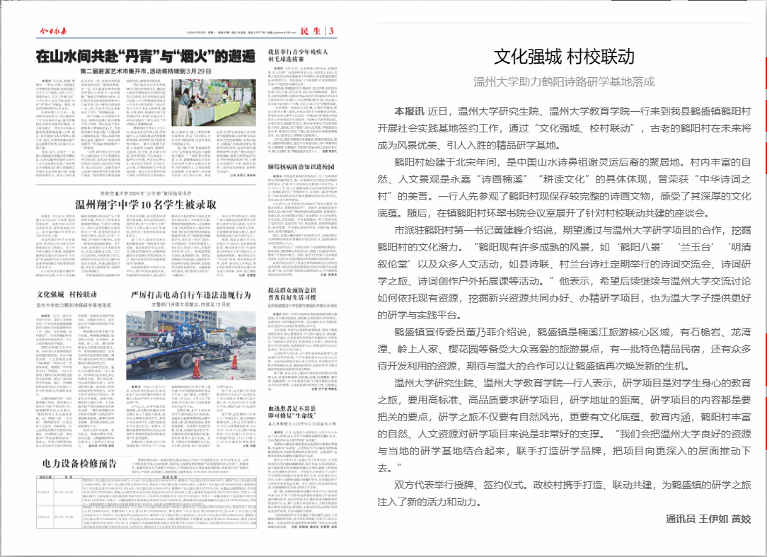 市派驻鹤阳村第一书记黄建峰介绍说,期望通过与温州大学研学项目的合作,挖掘鹤阳村的文化潜力。“鹤阳现有许多成熟的风景,如‘鹤阳八景’‘兰玉台’‘明清叙伦堂’以及众多人文活动,如县诗联、村兰台诗社定期举行的诗词交流会、诗词研学之旅、诗词创作户外拓展课等活动。”他表示,希望后续继续与温州大学交流讨论如何依托现有资源,挖掘新兴资源共同办好、办精研学项目,也为温大学子提供更好的研学与实践平台。