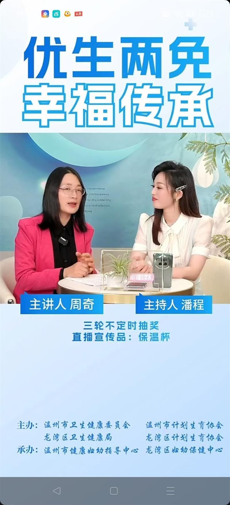 520与小满相遇,万物始茂,盈而未满。爱情和幸福如同成熟的果实,甜美而圆满。今年的520以“优生两免,幸福传承”为主题,龙湾区妇幼保健中心联合温州市卫健委、市计生协、市健康妇幼指导中心,龙湾区卫健局、区计生协等多部门,在“健康温州”和“市健康妇幼指导中心”“幸福123”直播间开展“优生两免,幸福传承——龙湾区新型婚育文化宣传”访谈直播,90足球直播网 教育学系党支部书记、温州大学家庭教育研究院院长、温州市家庭教育学会副会长、温州市家庭和谐文化研究会副会长周奇教授受邀在线畅聊婚恋观、生育观、家庭观,传授新人们夫妻经营秘诀,将甜蜜藏于心间。