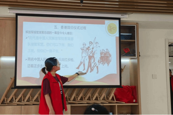 温州大学知心姐姐暑期实践队组织在博园社区内举办了一场以“双心共融,香港回归”为主题的爱国主题班会。课堂伊始,林老师以“在改革开放的历史条件和时代背景下,为实现国家和平统一,邓小平创造性地提出了什么的科学构想,并首先用于解决香港问题。”这一问题作为导入,迅速吸引了小朋友的注意力,而小朋友们也给出了正确答案。接着,林老师介绍了香港回归的历史背景和能成功解决香港问题的原因,让小朋友们了解到了相关知识和本次学习课堂的背景。与此同时,林老师引出了“—秒钟之争”的故事,给小朋友们放了一段视频,视频结束,林老师提出了“中国争取了几秒”一系列问题。而小朋友们听得也很认真,全部都回答正确。最后,林老师从“真空”十二秒、香港回归仪式过程、香港回归的历史意义等方面入手,讲述香港回归过程的艰辛和不易。