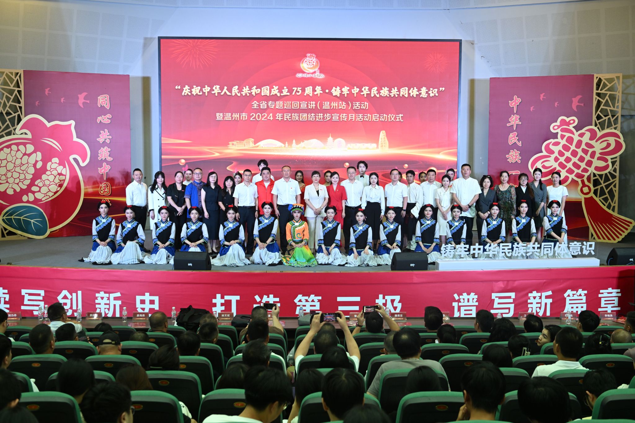 瓯越同心助强城,中华民族一家亲。近日,“庆祝中华人民共和国成立75周年·铸牢中华民族共同体意识”2024年度全省专题巡回宣讲活动(温州站)暨温州市2024年民族团结进步宣传月活动启动仪式在温州大学举行。10万余人次线上观摩本次活动。