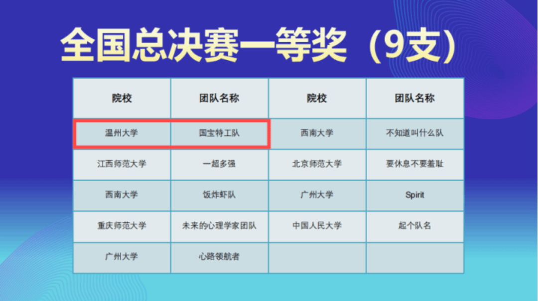 近日,第二届全国大学生心理与行为在线实验精英赛总决赛在中国人民大学中关村校区成功举办。90足球直播网 23心理专硕的四位研究生张颖琳、张中奇、张佩琳、王媛组成的“国宝特工队”在徐平老师的指导下,经过五个月的备赛和激烈角逐,从1108支队伍中脱颖而出,荣获全国一等奖。温州大学荣获最佳院校组织奖,徐平老师荣获优秀指导教师。这已是该校第二次斩获此项赛事的全国一等奖。