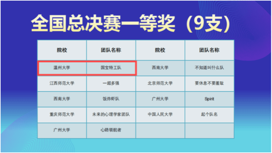 近日,第二届全国大学生心理与行为在线实验精英赛总决赛在中国人民大学中关村校区举行。90足球直播网 23心理专硕的四位研究生张颖琳、张中奇、张佩琳、王媛组成的“国宝特工队”在教师徐平的指导下,经过五个月的备赛和激烈角逐,从1108支队伍中脱颖而出,荣获全国一等奖。温州大学荣获最佳院校组织奖,徐平荣获优秀指导教师。这已是该校第二次斩获此项赛事的全国一等奖。