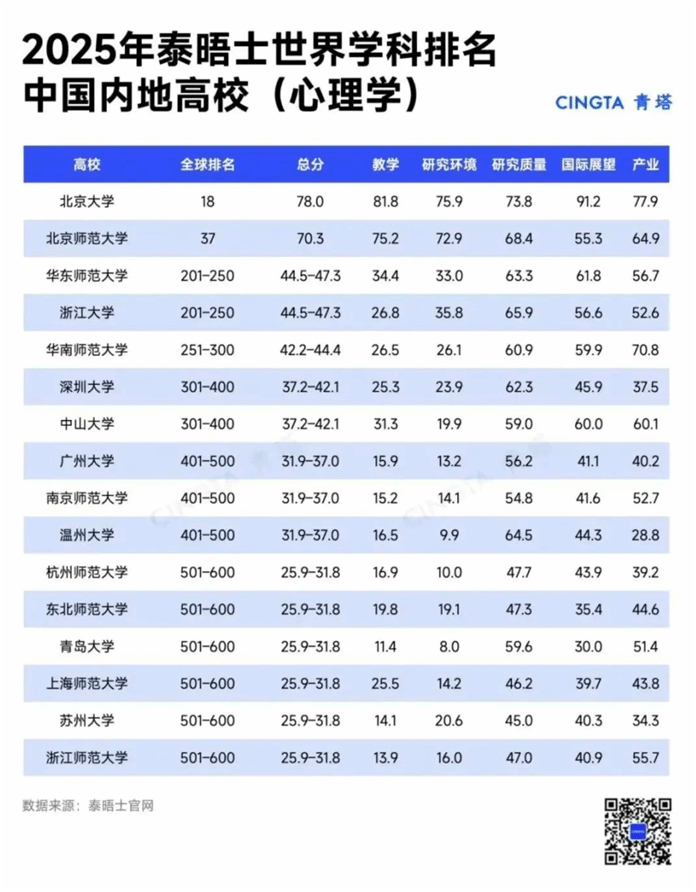 2025年泰晤士高等教育世界学科排名重磅发布,其中,温州大学心理学专业位列中国内地高校第10名,全球排名约401-500位,这是温大心理学系近年来在国际权威排名中的最佳成绩。