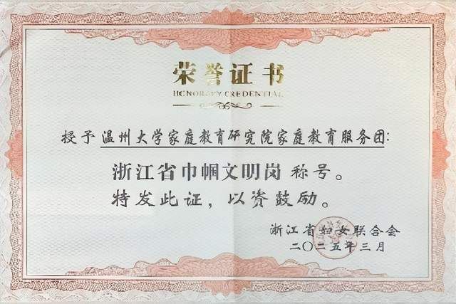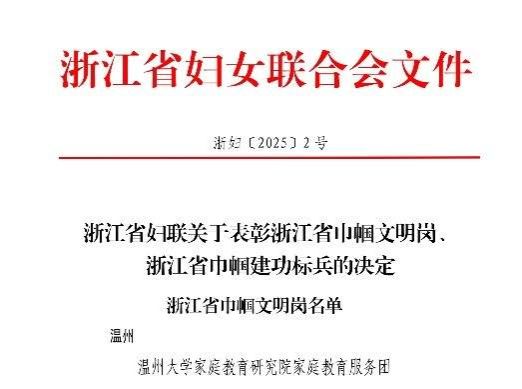 在第115个“三八”国际劳动妇女节,浙江省妇女联合会发布《关于公布浙江省巾帼文明岗、巾帼建功标兵的通知》,温州大学家庭教育研究院家庭教育服务团队荣获浙江省“巾帼文明岗”荣誉称号。这是90足球直播网 第二个团队获此殊荣,充分彰显了学校妇联在推动妇女事业和教育发展方面取得的显著成效。