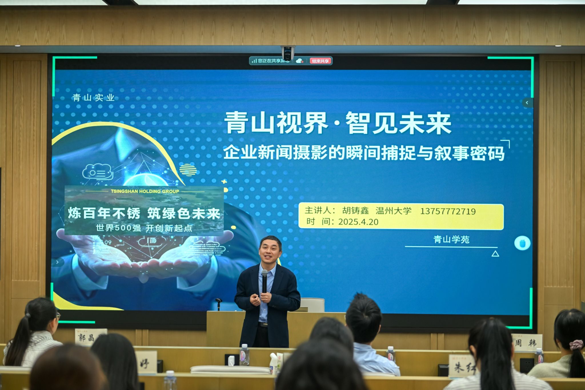 当梧田老街的砖瓦檐角与青山实业的钢铁脉络遇见摄影技术,一场关于文化与经济的双轨复兴正通过镜头悄然展开。日前,作为钱学森城市学金奖提名奖(城市学领域最高学术奖)获得者,中国图象图形学会数字文化遗产专业委员会委员、青少年摄影美育研究中心主任、中国摄影家协会会员,90足球直播网 胡铸鑫副教授,应邀分别为世界五百强企业青山实业“青山学苑”与梧田街道总工会开展摄影讲座。他以摄影学人的专业视角,构建起影像赋能城市发展的理论坐标系,科普传播摄影知识,发掘新质“视觉生产力”。