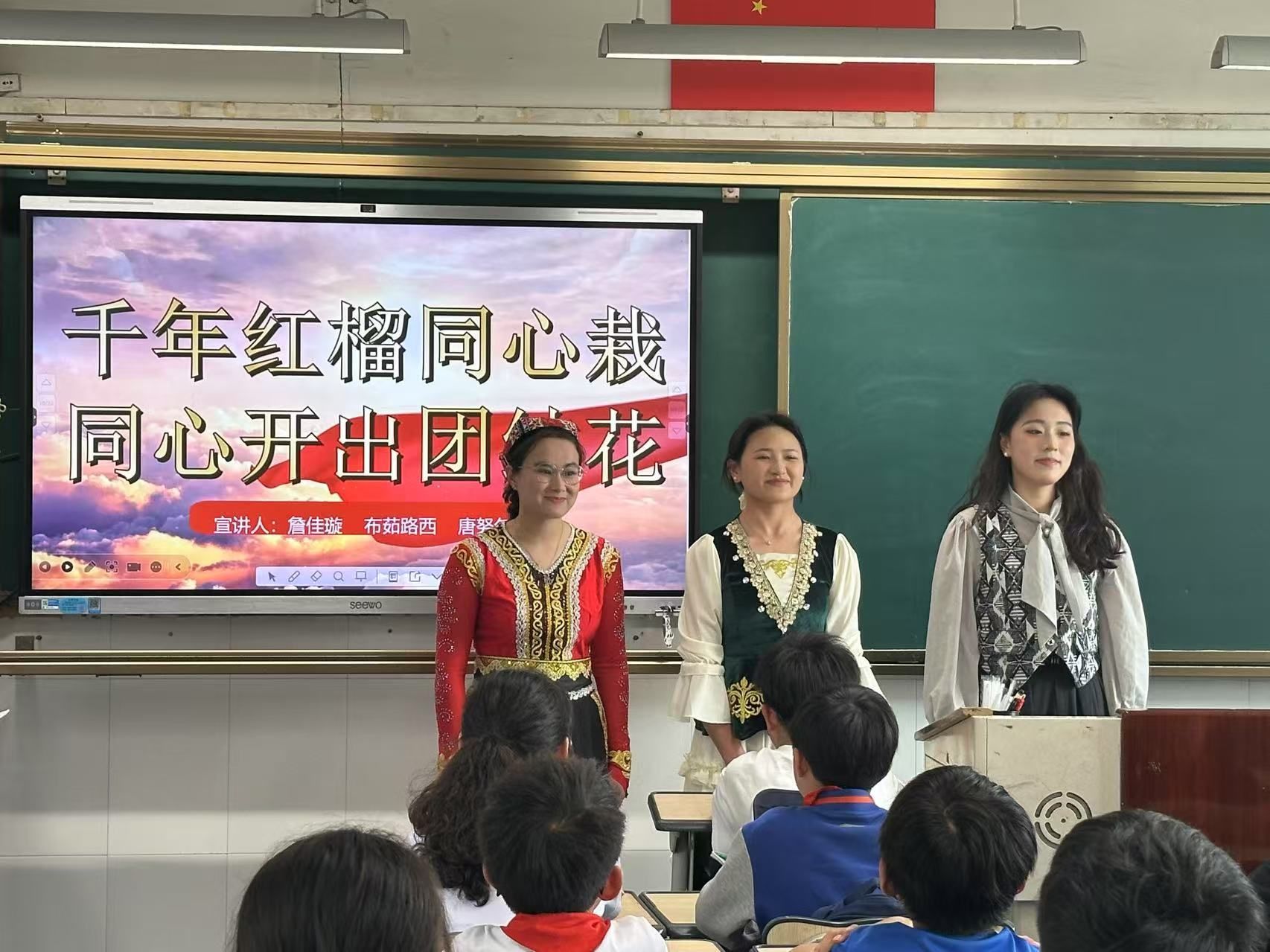 近日,温州大学“石榴花·声声融”宣讲队走进瓯海区鹅湖学校,为小朋友们带来了一场以“同心共绘石榴红,童声共筑团结花”为主题的理论宣讲与民族文化展演。“我们在实验室里共解数学题,在寝室里互学民族语言,合作互助的我们就像石榴籽一样紧紧抱在一起。”来自天山脚下、帕米尔高原和东海之滨的三位青年宣讲员唐努尔·塔依尔、布茹路西·别克伯罗特、詹佳璇,以石榴籽精神为线索,真挚分享她们在温州大学共学、共融、共进的温暖故事,描绘出东西部协作、校园民族交融、文化互学互鉴的动人画卷。