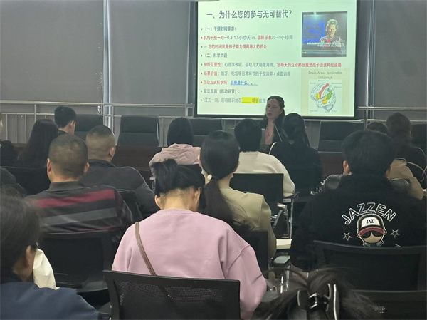 “我们可以换一种方式发起对话,先观察孩子当下感兴趣的事物,再用简单语言对这些事物进行描述,吸引孩子的注意力,让孩子主动加入对话。”授课老师从日常沟通中的典型难题入手,引导家长们通过角色扮演逐渐掌握用温和的语言、夸张的表情吸引对方关注,课堂氛围专注又温馨。团队还为每个家庭配备了内含自检表、打卡表等实用工具的《家庭干预工具包》,鼓励家长从日常小事做起,干预就能取得好效果。