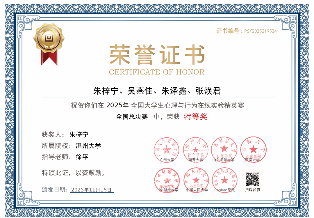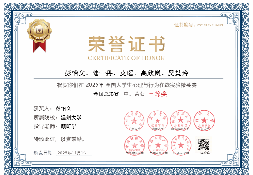 日前,第三届全国大学生心理与行为在线实验精英赛总决赛在中央财经大学圆满落幕。温州大学学子凭借扎实的专业功底与创新的实验设计,从全国323所高校的6694名参赛者中脱颖而出,斩获研究生全国特等奖、本科生全国三等奖。