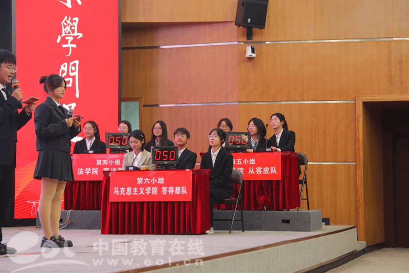 “发展路上不掉队”,人文学院“仄仄平平仄队”;三等奖获得者为法学院“廉洁智多星”,外国语学院“从容应队”,马克思主义学院“答得都队”。