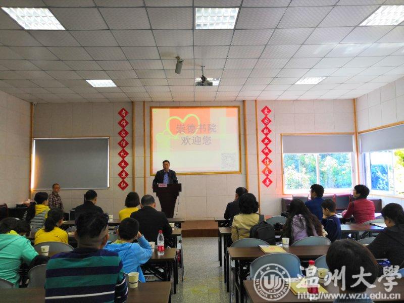学院师生到达崇德书院后,受到了瑞安市委党校原常务副校长、崇德书院创办人、温大校友郑超豪先生的热情欢迎。在全体起立唱国歌仪式结束后,郑先生为师生进行了一场生动而有意义的道德讲座,他向大家详细介绍了崇德书院创办5年来,坚持做好慈善和道德实践教育的情况。不论严寒酷暑,每天早晨向环卫工人奉上爱心面包,以及为社会各界人士开展道德教育与培训,感化与教育问题青年反哺社会等弘扬德行、传播爱心的道德实践过程。师生一行认真学习,深切感受道德力量,陶冶道德情操。学院党委书记杨立淮表示,社会是最大的课堂,身边有感动的力量,温州是一座大爱之城,崇德书院是厚德的沃土,以郑超豪先生为代表的慈善道德人物做了很好的示范,是师生道德学习与践行的航标,引起了全体党员师生的强烈共鸣。最后,杨立淮书记诚挚邀请郑先生今后多回母校与学院师生多交流。