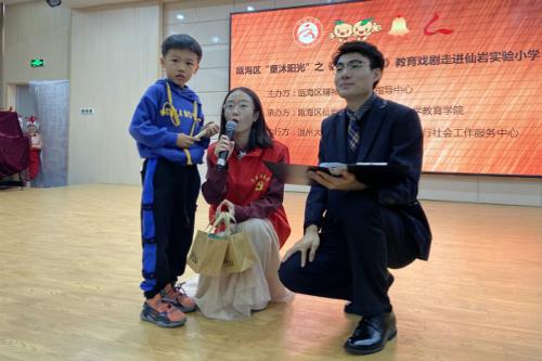 接着,温州大学沐童翎教育戏剧社指导老师章园园发表讲话,她表示将戏剧融入教学的理念起源于法国,我国目前处于初步发展阶段,戏剧社将坚持关爱新居民子女和留守儿童的初心,设计更多优秀的课本剧,并将公益演出送到更多学校,送到更多孩子们身边。