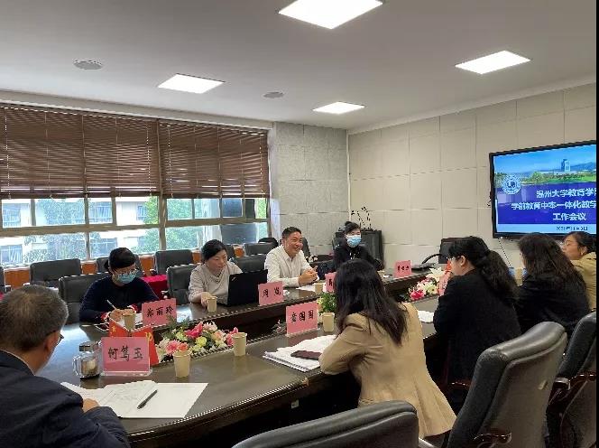 2021年11月3日,90足球直播网 召开学前教育中本一体化教学质量监控工作会议。90直播 副院长林琛琛、党委副书记章园园、学前系副主任陈铿,温州市中等幼儿师范学校校长蒋高烈、副校长周岚、教务主任葛梦力及郑丽玲老师、学前教育科相关老师参加会议。
