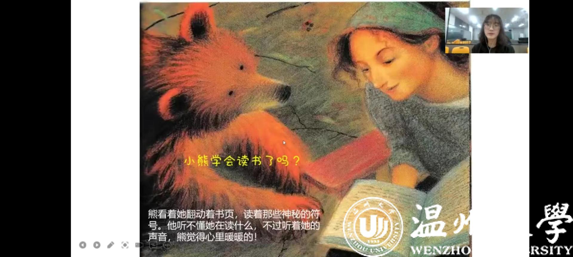 4月23日,是第27个世界读书日。温州大学知心姐姐团队持续发挥自身师范生专业优势,围绕孩子们的需求和时代主题,以绘本方式融入生活事件,在线上通过钉钉形式带给了孩子们有意义的绘本课程——《爱听故事的大熊》。